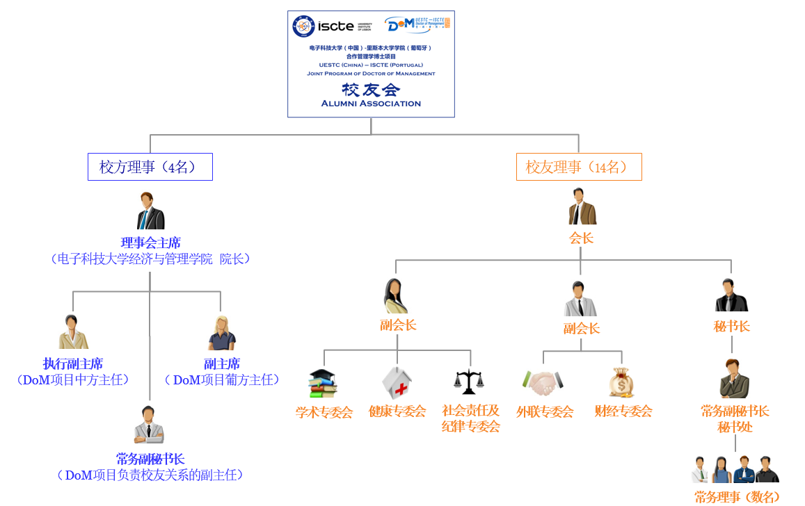中国电子科技大学—葡萄牙里斯本大学学院合作管理学博士项目至2009年正式招生以来,在中外合作办学上成效显著,学员规模逐年扩大,并在国内外拥有了一定声誉。为了学校、学院和项目校友保持持续的良好关系,让校友为学校及学院做出更大的贡献,“中国电子科技大学—葡萄牙里斯本大学学院合作管理学博士校友会”(以下简称为“UESTC-ISCTE博士校友会”)于2015年12月12日在电子科技大学正式成立,葡萄牙驻华大使及葡萄牙驻华大使馆经济参赞出席了成立典礼。 UESTC-ISCTE博士校友会的宗旨是服务于电子科技大学经济与管理学院、电子科技大学以及博士项目校友的利益;为学校、学院及其校友之间提供一个沟通渠道;管理校友组织和项目;为校友了解学校、学院及项目的发展并提出适当建议提供合适的途径。UESTC-ISCTE博士校友会致力于促进校友与学校及学院的终身联系,服务于本博士项目的校友,并协助他们成为学校及学院发展的杰出贡献者。 UESTC-ISCTE博士校友会理事会由“校方理事”和“校友理事”组成。首届理事会成员18人,其中,校方理事4人,由中外双方合作院校指派;校友理事14人,由校友从各个年级中选举产生。