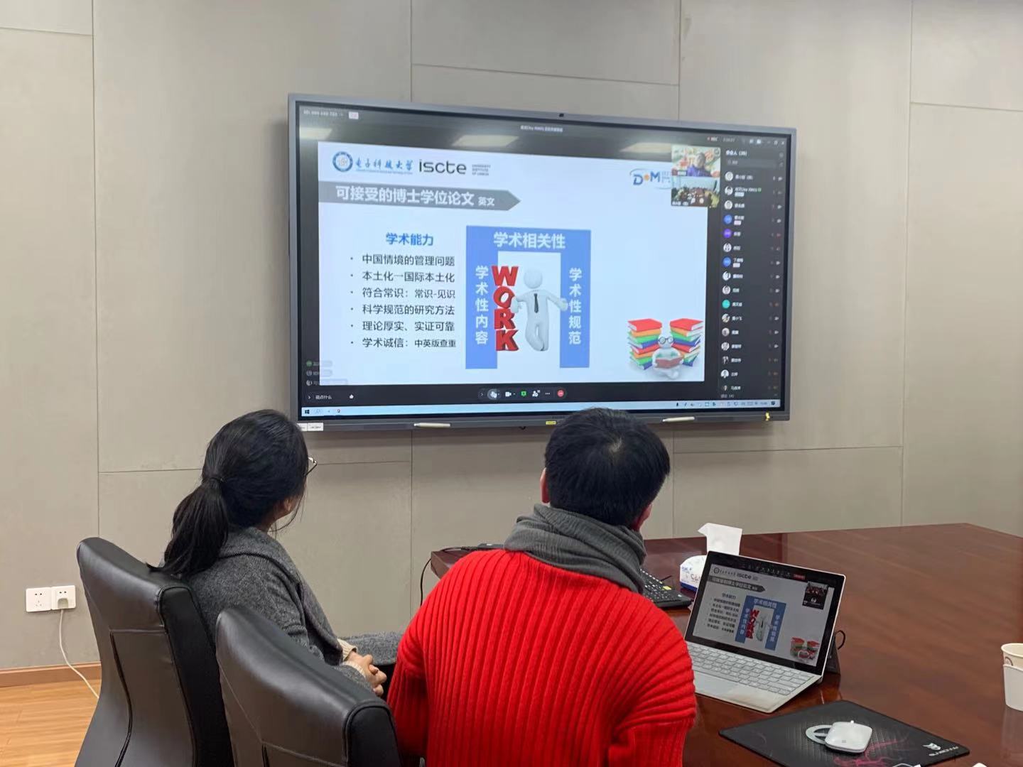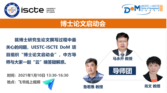 2021年1月10日,电子科技大学(中国)—里斯本大学学院(葡萄牙)合作管理学博士(DoM)项目2020级博士论文启动会以飞书线上视频的方式进行。就博士论文撰写中学员最关心的问题,经管学院马永开教授、鲁若愚教授、DoM中方项目主任肖文教授与学员相聚“云”端,为大家答疑解惑。