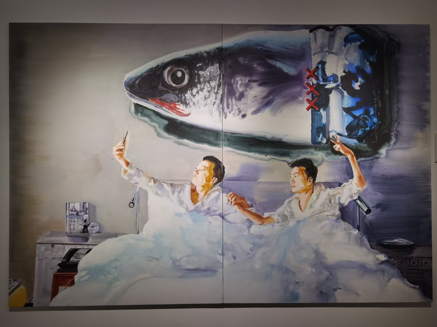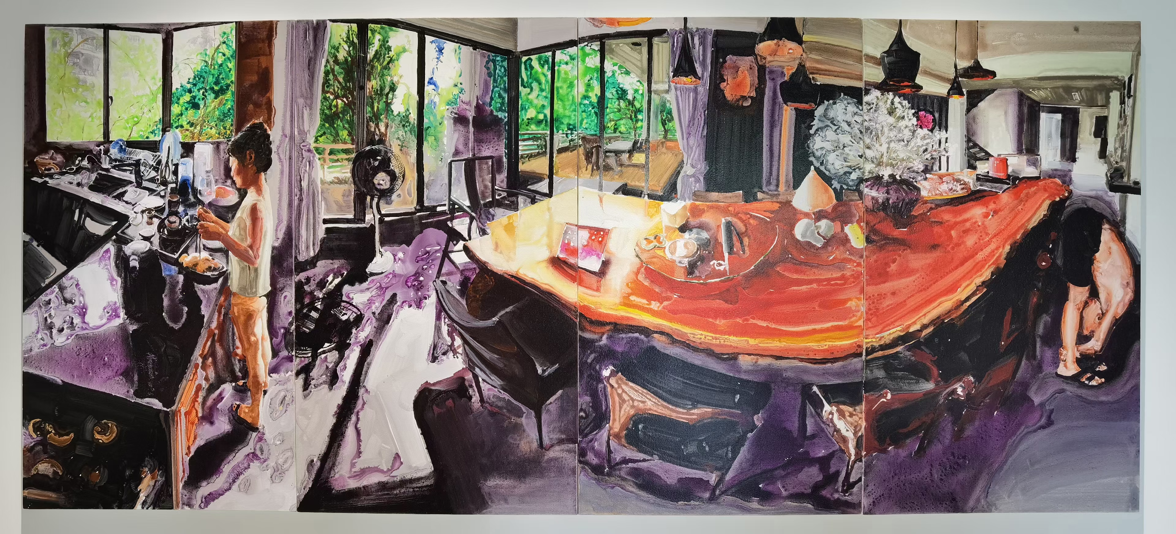 王大师首先介绍了两幅源自自身家庭生活场景的画作。从艺术的角度,用绘画语言,勾勒了家庭生活温馨的点滴。画作《带着爸爸去旅行》写实重庆一家三口温馨旅途,着墨了家庭未来、传承与希望的主题;《在水一方》取材自国内某一著名教育工作者一家相聚日常;《在路上》勾画了极具代表意义的中国中产阶级家庭,以孩子的成长为目标,兼具家庭的成长,一直行走在向前的路上;《飞飞鱼鱼》描绘了一对特殊年轻恋人的家庭故事,随着社会的发展,家庭的概念更具包容性;《一个人未必不是风景》讲述了上海一位单身主义女性的别样精彩;《散落在塔斯马尼亚的记忆》是一组故事集,反映了家庭的成长与社会发展的重合;《发哥的一亩三分地》展示着中国家庭更高的精神追求与文化素养......。