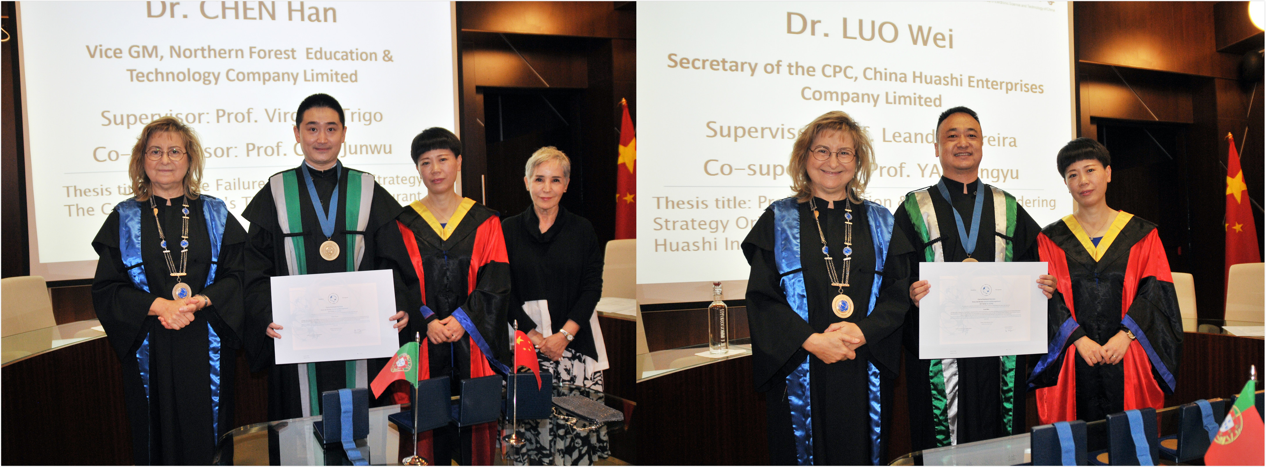 2019年7月15-16日,电子科技大学(UESTC)-里斯本工商管理大学(ISCTE)合作管理学博士(IDMgt)项目4名学员远赴葡萄牙里斯本参加博士论文毕业公开答辩,他们分别是2013级学员陈涵、罗炜和2014级学员何奇兵、贾东风。4名学员在中外双方论文导师的悉心指导下,经过4~5年的潜心专研,通过了论文开题、中期检查、预答辩、公开答辩等重重考验,终于拨云见日,获得ISCTE颁发的管理学博士学位。7月17日,ISCTE为4位新晋博士准备了专场毕业典礼,典礼上里斯本工商管理大学副校长Maria das Dores教授和电子科技大学导师代表、IDMgt项目主任肖文教授为4名学员授予了ISCTE颁发的管理学博士学位证书和勋章。