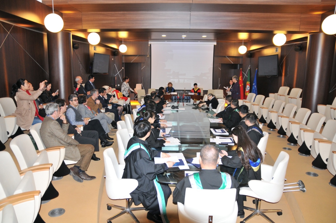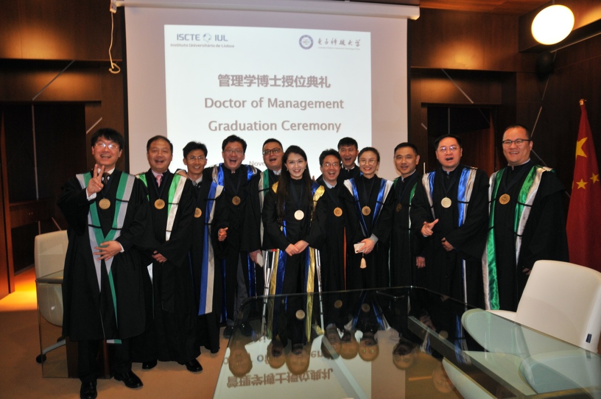 15名学员在经历了每场近3小时的公开答辩后,答辩委表决通过各学员的博士毕业论文答辩。11月15日下午,15名博士迎来他们的毕业典礼,典礼上里斯本工商管理大学分管国际事务的副校长Maria das Dores Guerreiro教授和电子科技大学经济与管理学院IDMgt项目主任肖文教授为学员颁发ISCTE的管理学博士证书和勋章。ISCTE的Maria das Dores Guerreiro教授回顾了十年来双方的友好合作,并对加强未来的继续合作寄予厚望。肖文教授代表UESTC发言,表达了对15位学员的祝贺。2013级的学员姜澍代表所有通过毕业答辩的博士发言,以一篇散文诗《也短,也长》回顾在IDMgt攻读博士的难忘经历,感恩师恩永难忘,同窗情谊长。学员老师共唱校歌,授位典礼在热烈的氛围中圆满结束。