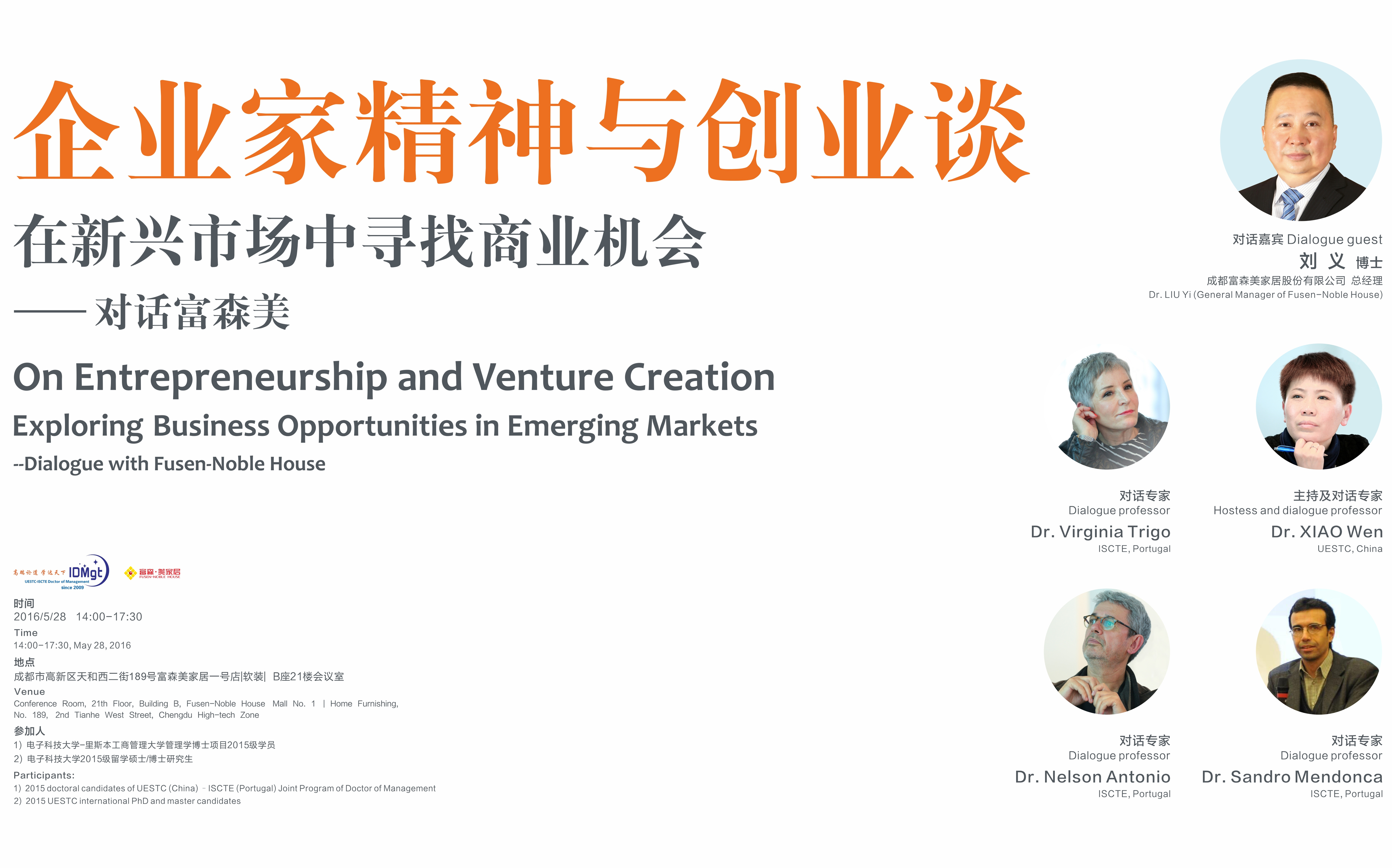 IDMgt2009级刘义博士(成都富森美家居股份有限公司总经理)担任现场对话嘉宾,UESTC肖文副教授(IDMgt中方主任)担任主持及中方对话专家,ISCTE的 Virginia Trigo教授(IDMgt外方主任)、Nelson Antonio教授和Sandro Mendonca副教授共同担任外方对话专家。