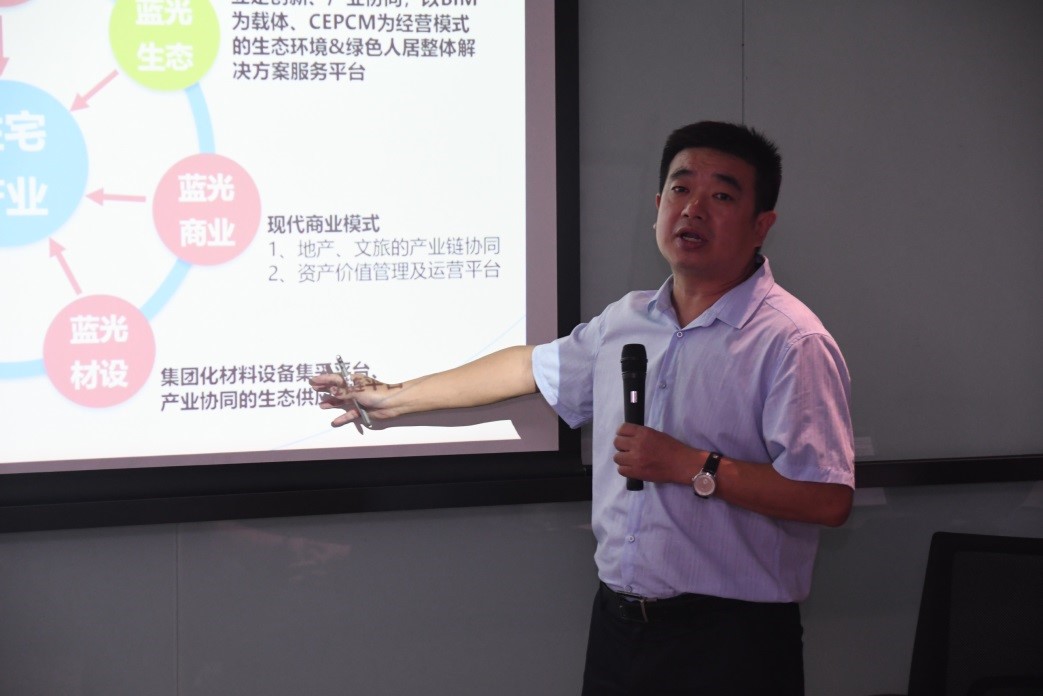 接下来,程耀贵博士向参访师生详细介绍了蓝光生态的转型点、进程与未来规划;蓝光生态优居科技事业部副总经理袁绍冲讲解了蓝光购房后的装修案例,介绍了蓝光生态通过与客户互动,满足个性化需求等方式来提高客户装修满意度的做法。
