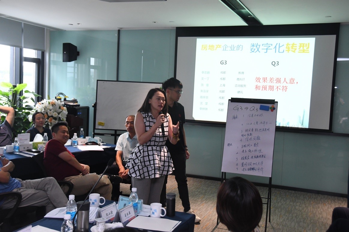 随后的分组讨论环节,学员们投票选出“房屋装修中5大痛点的原因和解决方案”,并就话题与企业嘉宾进行了分组讨论。2小时的讨论过程中,组员们脑力激荡,互动热烈,细究5大痛点背后的原因,积极提出各自的解决方案。在随后的组间交锋中,针对别组方案,学员们唇枪舌剑,提出更多犀利问题,将讨论引向深入和多面向。
