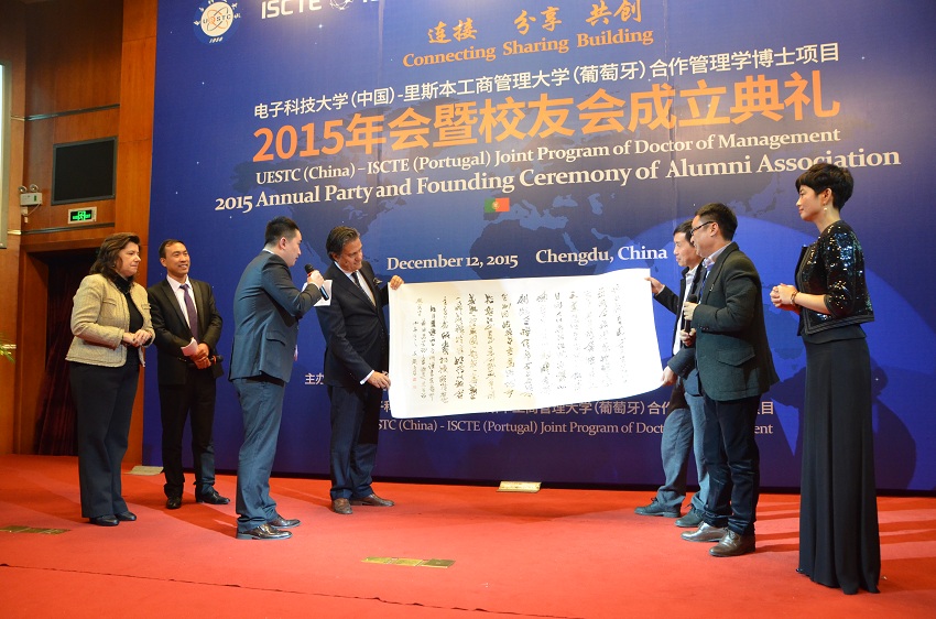 校友会当选会长杨永胜博士发言感恩两所母校,并就校友会提出五点倡议:“行大道、利天下;聚合力、树正气;有良知、能担当;建平台、重参与;守底线、重合规”。他指出,校友会应该关爱社会、关爱母校、关爱校友,积极投身于公益和慈善事业,积极资助电子科技大学和葡萄牙里斯本工商管理大学的困难学生;阳光从业、阳光交往、合法合规、共享价值;为母校发展和社会和谐发展做出更多更大的贡献。随后,校友会秘书长朱琳琳博士作了报告。她介绍了UESTC-ISCTE博士校友会的组织构架和宗旨,也汇报了UESTC-ISCTE博士校友会理事会的职责、理事的构成、任期及资格取消和到理事会的运作流程和管理办法。新成立的校友会还向葡萄牙驻华大使、葡萄牙驻华大使馆经济参赞以及葡方教授嘉宾赠送了校友自己作诗的书法及校友会会歌MV光盘。