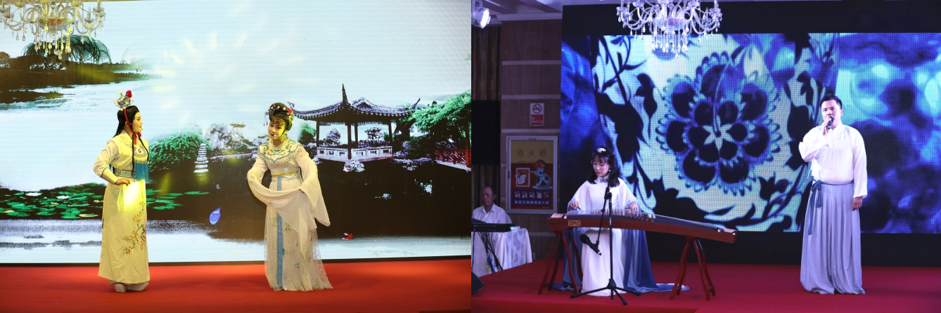 为契合此次年会举办地杭州的灵秀之气,两位越剧老师应邀前来,一曲《天上掉下个林妹妹》选段,尽显江南风雅,引来台下学员的悉心聆听和击节吟唱。2017级学员杨经纬和2018级学员盛丹萍共同带来一曲《青花瓷》,袅袅琴音如山涧泉鸣,似环佩铃响,搭配低沉婉转的吟唱,给全场带来一场视听盛宴。