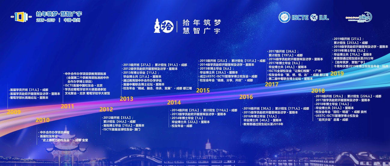 2019年9月20-21日,电子科技大学(中国)—里斯本工商管理大学(葡萄牙)合作管理学博士项目(IDMgt)“【拾年筑梦,慧智广宇】十周年庆暨2019年博士校友会年会”及校友活动在美丽的西子湖畔杭州举行。九月的杭州正值桂花时节,花香四溢,飘香十里,近130名来自天南地北的商界精英、学界专家校友共赴诗情画意的杭州参加此次盛会,校友们同聚一堂,共商发展,共叙情谊。IDMgt项目于2007年启动,2009年第一届学员入学,至2019年已招生9期,共253名学员。截止2019年9月,已有70名学员获得管理学博士学位,6年学制期满的博士毕业率为91.2%。