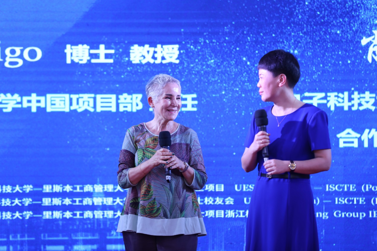 开幕式的最后,ISCTE中国项目部主任Virginia教授和IDMgt项目主任肖文教授共同致辞,回顾十年历程。Virginia教授回望十年前项目启动初期的种种不确定,到十年以来取得的丰硕成果,她希望大家共同努力,把IDMgt项目的成功延续下去。Virginia教授还动情地表示,过去十年,她与学员们建立起远超师生关系的深厚情谊,并由衷希望中葡两国间的文化融合更进一步。肖文教授则以三个关键词总结了十年历程。她提到的第一个关键词是“反思“,IDMgt项目做成了国内唯一的十年以上的中外合作办学博士项目,我们要反思接下来的十年还需要做对什么;第二个词是“新常态”,十年发展与积累,我们面临着各式挑战,未来我们的重心将从“数量和速度”,转移至“质量与品质”;第三个词是“品格”,博士研读是修行的过程,学员们除了学识的积累,更应塑造自身品格,成就更好的自己。